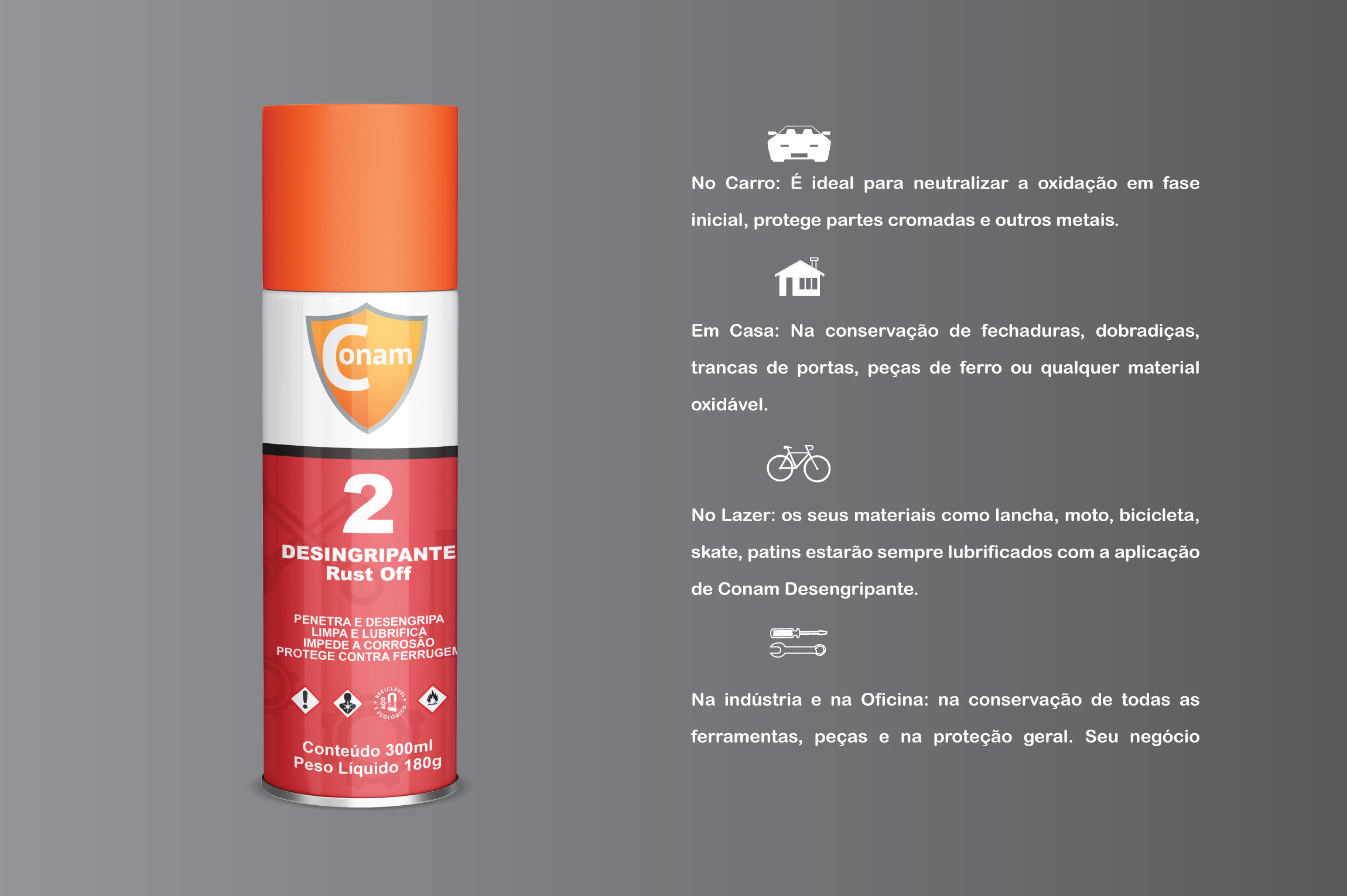 Desingripante CONAM é um produto multiuso desenvolvendo especialmente para desengripar elementos metálicos, lubrificar e proteger contra ferrugem e corrosão. Através de aplicações regulares, mantém uma película protetora, agindo contra as ações do tempo. Por ser um produto multiuso, pode ser utilizado em diversos segmentos: mercado automotivo, indústria, residência, escritório, lazer ou esporte.